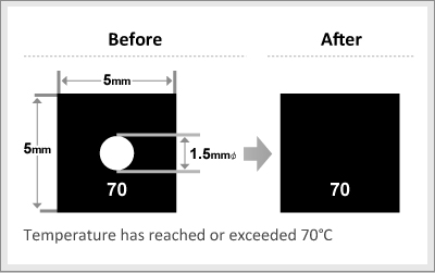 THERMO LABEL ¢ç SUPER MINI 1K is single-use indicators irreversibly change its color from white to black by reaching or exceeding color changing temperature. The indicator element is only 1.5mm¥õ and the label itself is a square 0.5cm on a side. Best suited for temperature control of electronic and electric parts like transistor, IC, capacitor and small motor.