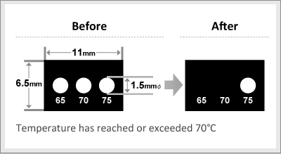 THERMO LABEL ¢ç SUPER MINI 3K is a single-use indicators irreversibly change its color from white to black by reaching or exceeding color changing temperature. Very small 11mm¡¿6.5mm area has